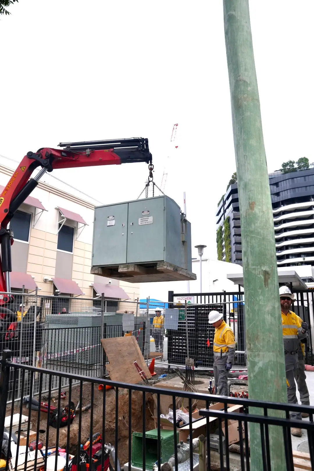 A crane lifting equipment on a high-voltage installation site surrounded by trees, with workers wearing safety gear overseeing the operation – GAP Industries project.